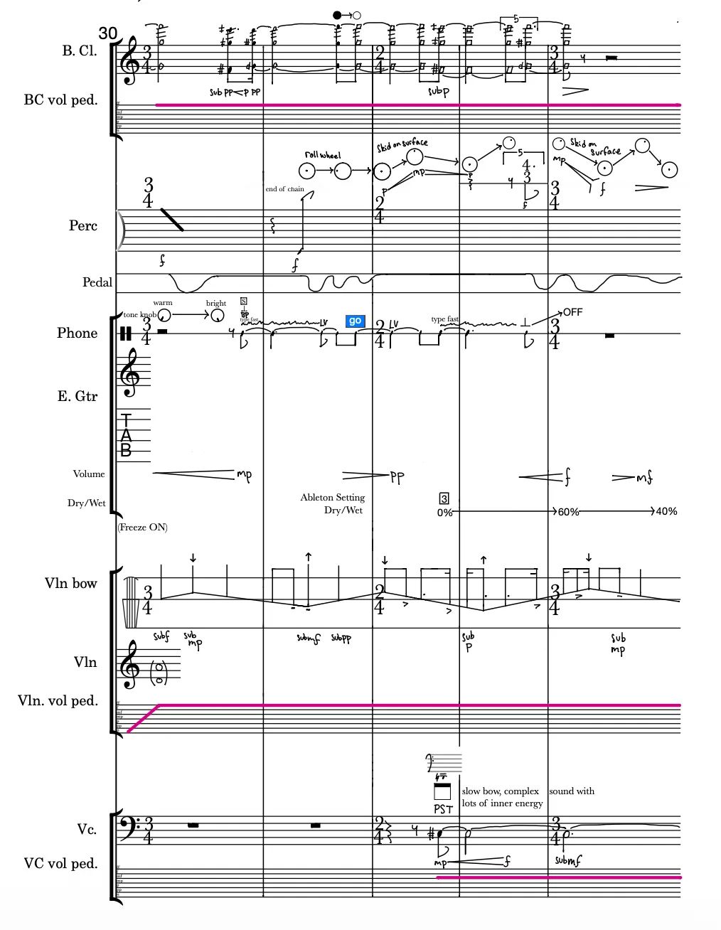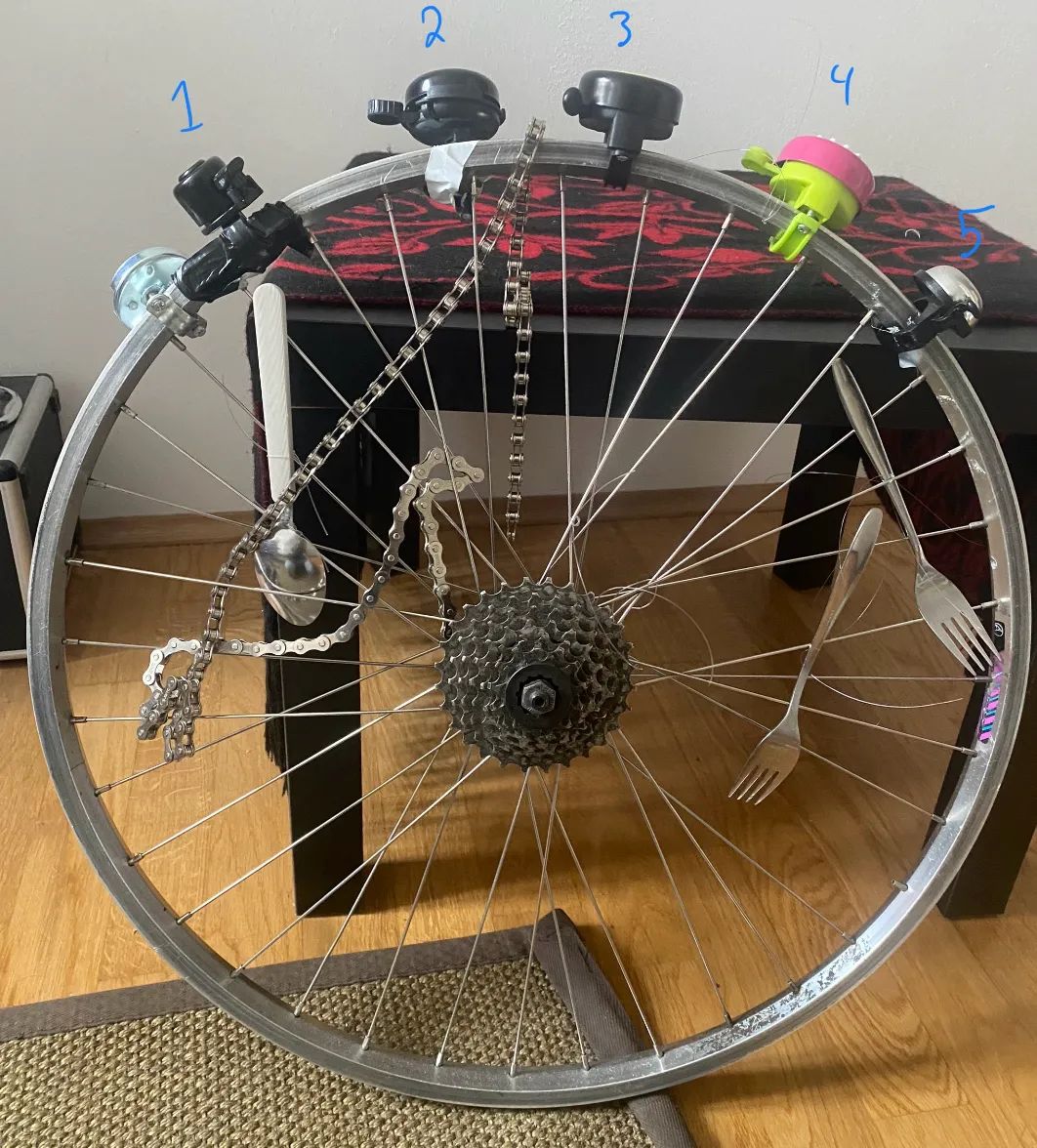 bass clarinet, electric guitar, bike wheel, violin, cello