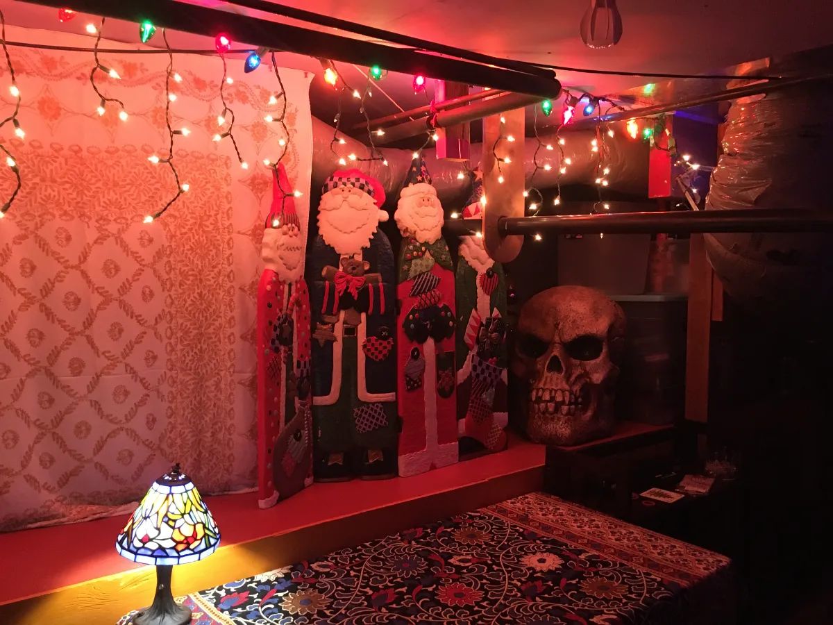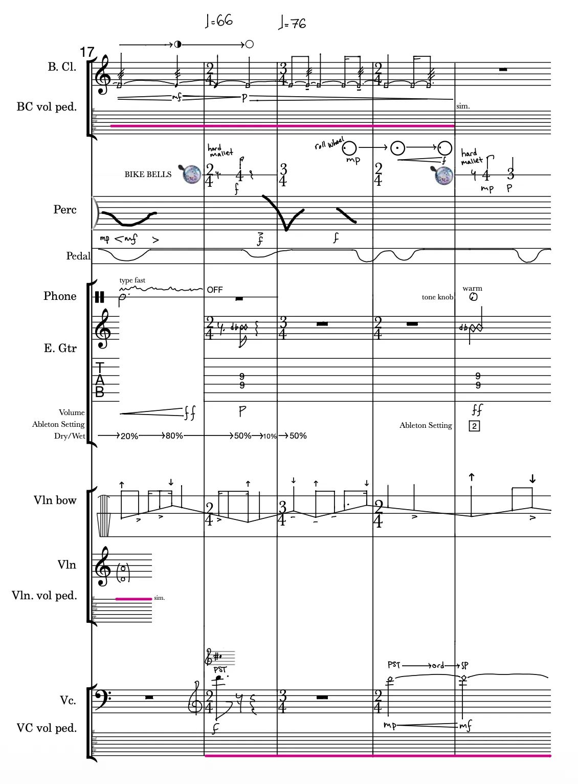 bass clarinet, electric guitar, bike wheel, violin, cello